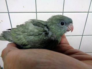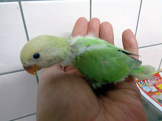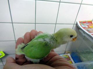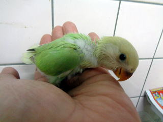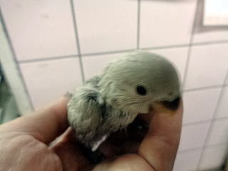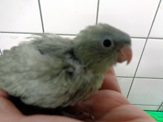 手のりコザクラインコ (ターコイズグリーンシナモン) 9月27日生まれ 3万円(税込) とてもめずらしいカラーのヒナです。 2025/10/19撮影 |