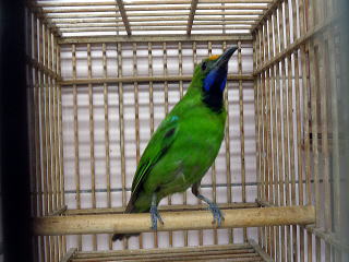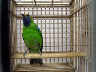 | キビタイコノハドリ(2026年4月マレーシア輸入) オス 89,000円(税込) 緑色基調のとても美しい鳥です。 鳴き鳥としても有名です。 オス2羽入荷しました 2026/4/28撮影 |