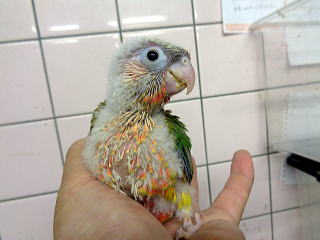 | ヒメコンゴウインコ(2025年10月タイ輸入) 2025年7月7日生まれ メス 48万円(税込) PBFD,クラミジア検査済み(陰性) 1日3回さし餌してます。とてもよく馴れています。 2025/10/22撮影 |