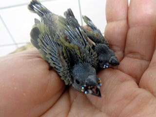 手のりコキン鳥(ノーマル) 1月2日生まれ 16,000円(税込) 体格大きいです。 両親ともに赤頭・紫胸です。 2026/1/19撮影 |